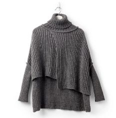 Этот стильный вязаный пуловер, представляющий собой нечто среднее между свитером и пончо, отличается уникальным дизайном с запахом и уютной горловиной-водолазкой. Асимметричный подол и подвороты на рукавах и горловине придают этому удобному в носке изделию особый шарм. Классические ребристые вязаные петли прекрасно смотрятся в сочетании с пряжей Patons Classic Wool Worsted.