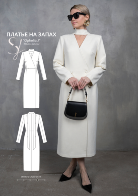 Выкройка платья малого объема, приталенного силуэта, отрезное по линии талии. Прилегание по полочке создано за счет нагрудных вытачек, выходящих из рельефного шва, фигурного рельефного шва и талиевых вытачек. На спинке прилегание создано за счет плечевых и талиевых вытачек. Рукав длинный, двухшовный, втачной, умеренного объема. Застежка платья двубортная, выполнена на петлю и пуговицу. Вырез горловины глубокий, V-образной формы. У платья предусмотрен съемный шарф. Платье на отлетной подкладке по спинке, полочке и рукавам. Длина платья до середины икры.