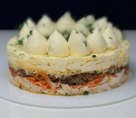 Слоеный салат с корейской морковью, курицей и грибами — это вкусное и сытное блюдо, которое подойдет как для праздничного стола, так и для обычного семейного ужина.